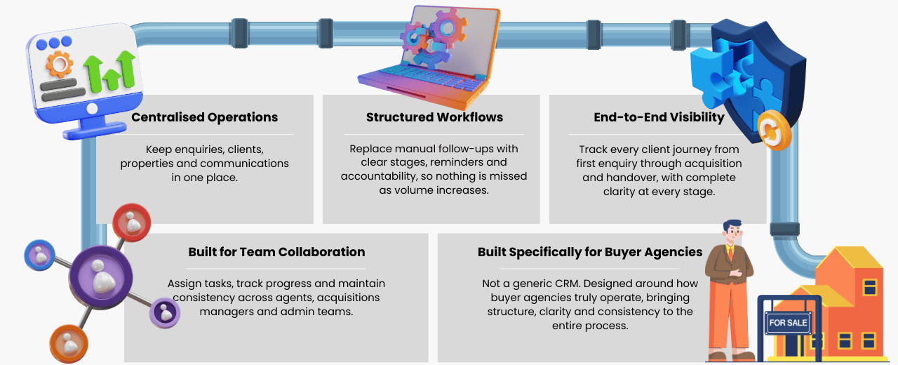 Australia's first ever all-in-one ecosystem built for buyer agents, helps businesses run their day-to-day operations better. Close more deals, build lasting buyers relationships and grow your business effortlessly.